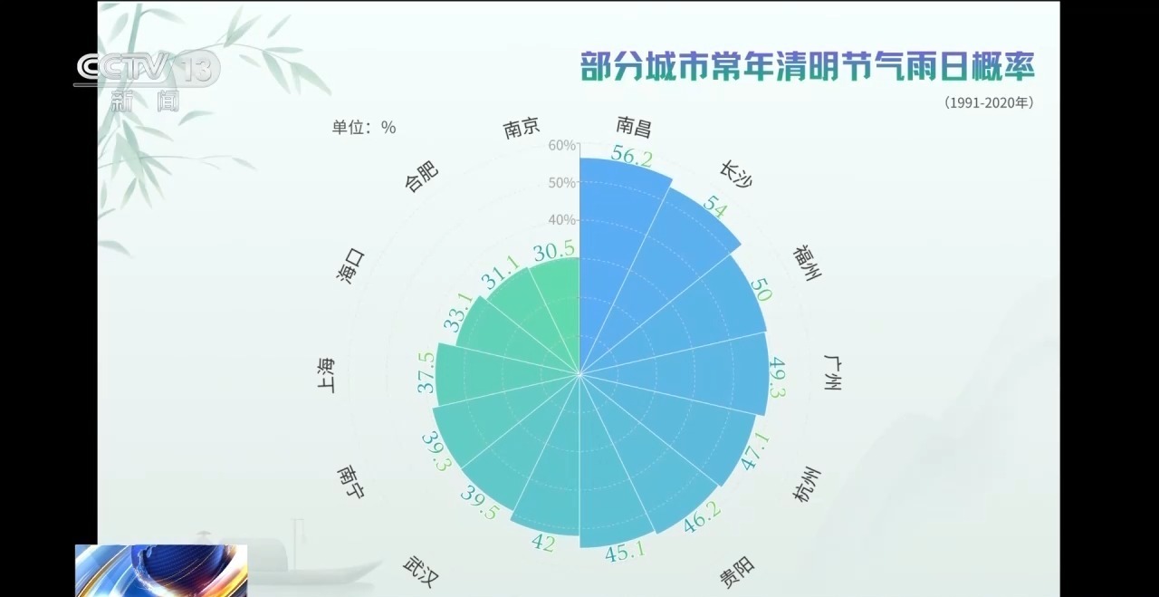 中国农业大学副教授 胡琦:我们研究发现,最近十年南方地区清明时节的降水概率可以达到70%到80%,而谷雨节气降水概率就骤降至40%以下,也印证了这一规律。